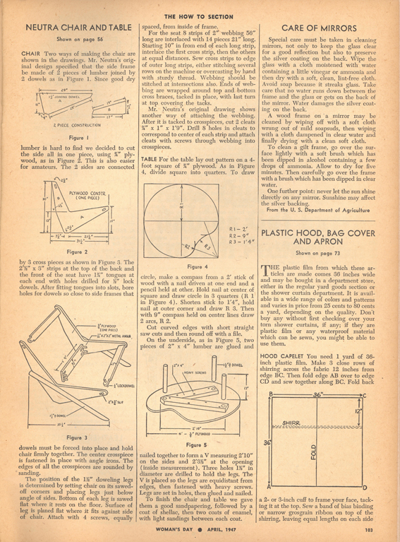 Neutra’s “recipe” for constructing the Boomerang Chair, along with instructions for building laundry hampers and cleaning glass. Woman’s Day Magazine, 1947.